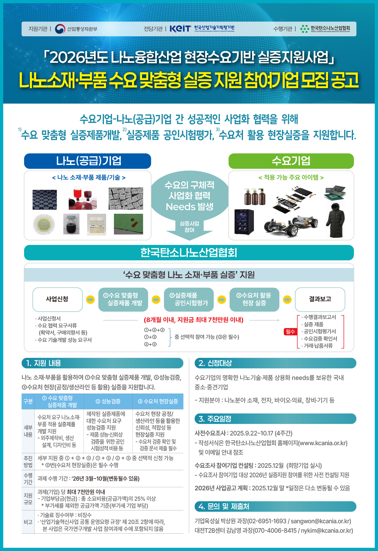 - 지원내용 : 나노소재·부품·기술을 활용하여 ①제품개발 ②성능검증 ③수요처 현장 실증 지원
